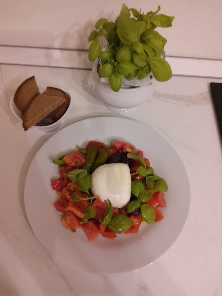 Ho preparato…pane integrale dell’Alto Adige…abbinamento ideale con il pomodoro condito e tanto gustoso…non può mancare il basilico che da buon sapore e sprigiona profumo in tutta la casa…con aperitivo frizzante al sapore d’arancia…