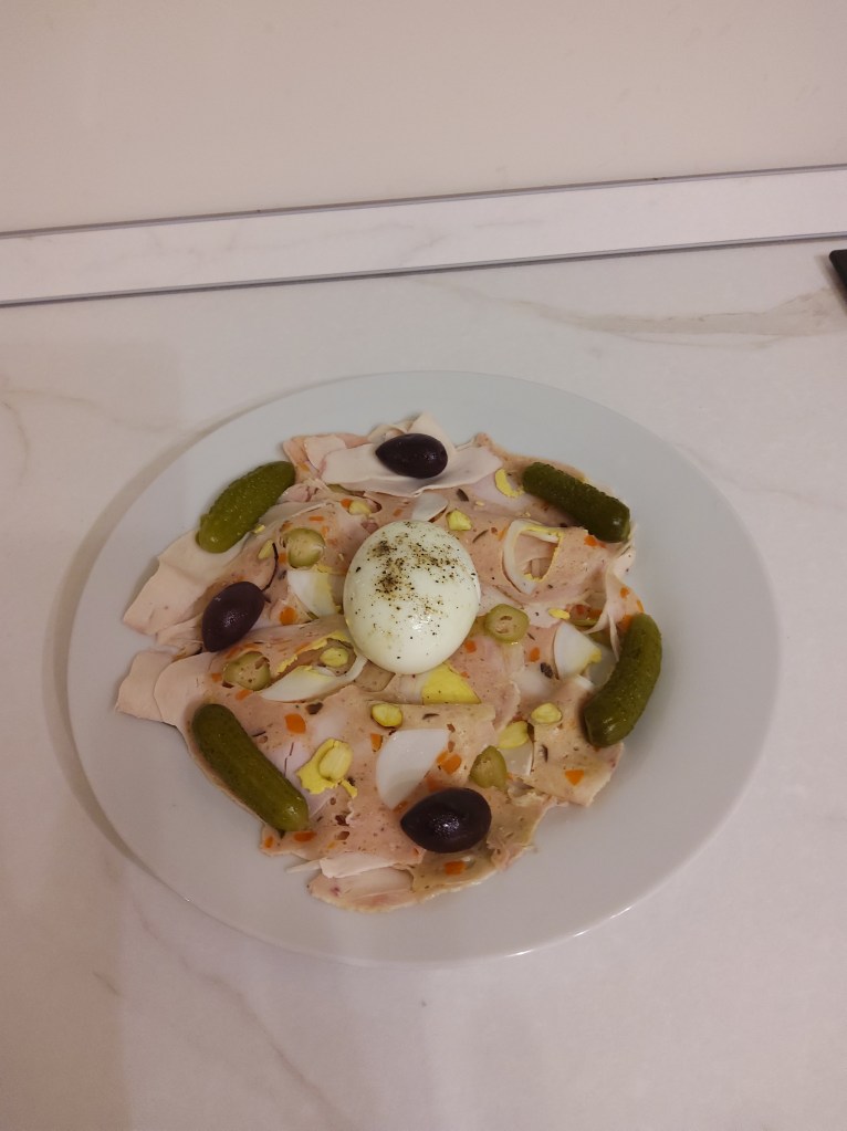 Gustare la galantina…il nostro palato ringrazia!..Delicata di gusto con aromi naturali…piatto tra i classici…è piatto nobile!..Galantina di pollo preparata con …carota…cipolla…sedano…mortadella…pistacchi…olive…uova…parmigiano noce moscata!..Tagliata a fette e gustata fredda è davvero squisita!..
